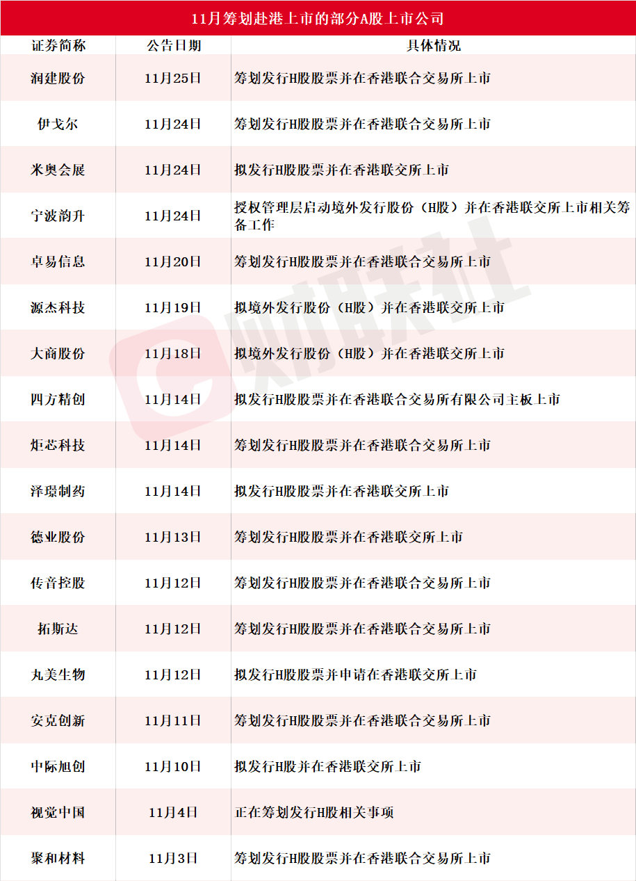 财联社11月30日讯(编辑 若宇)A股公司赴港上市热潮持续。据财联社不完全统计,11月包括、、、、、、、、、、、、、、、、、在内的18家A股上市公司披露筹划赴港上市,详细情况见下图: